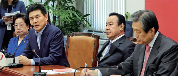 김무성 새누리당 대표(오른쪽 끝)가 10월23일 최고위원직을 사퇴하겠다는 김태호 의원의 발표를 듣고 있다. 김 대표는 최근 중국에서 개헌 불가피론을 제기했다가 개헌에 부정적인 박근혜 대통령과 각을 세웠다는 해석이 나오자 자신의 발언을 철회하는 소동을 벌였고, 이어 김태호 의원의 최고의원 사퇴 발언까지 불거져나오면서 리더십에 흠결이 났다. 한겨레 김경호 선임기자