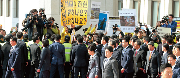 세월호 유족들의 울먹임을 듣지 못했을까? 듣고도 모른 체한 걸까? 박근혜 대통령(아래 가운데)이 지난 10월29일 국회 시정연설을 마친 뒤 본청 앞에서 “진실을 밝혀달라”는 유족의 외침을 외면한 채 걸어가고 있다. 국회사진기자단
