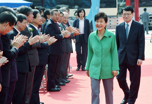 안광한 MBC 사장이 지난 9월1일 상암동 MBC 신사옥에서 열린 ‘MBC 상암시대 개막 기념식’에 박근혜 대통령과 함께 입장하고 있다. 청와대사진기자단