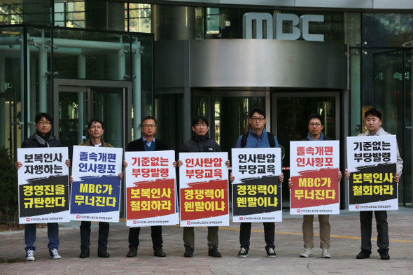 지난 11월4일 아침 8시, 전국언론노동조합 MBC본부 조합원들이 10월31일의 인사에 대해 “기준 없는 부당발령이자 보복 인사”라며 철회할 것을 요구하는 피케팅을 서울 상암동 신사옥 앞 광장에서 벌이고 있다. 류우종 기자
