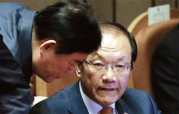 최경환 경제부총리는 최근 “무상급식을 (지급할) 법적인 근거가 없다”며 무상복지 논쟁에 불을 붙였다. 황우여 교육부총리는 지난 11월20일 무상보육의 일환인 누리과정 예산 증액(5600억원)에 합의했다가 여당지도부의 반발로 묵살되는 수모를 겪었다. 10월29일두 부총리가 국회에서 얘기하는 모습. 한겨레 김경호 기자