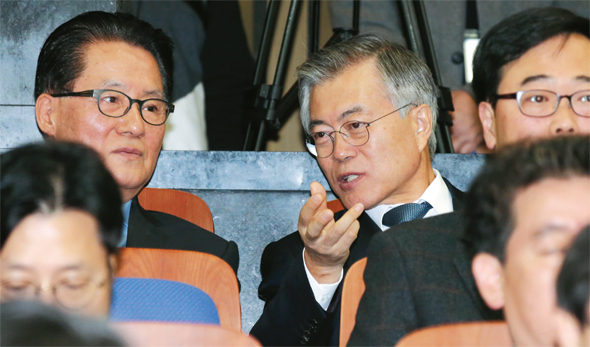 지난 11월14일 서울 여의도 국회에서 열린 새정치민주연합 예산정책 의원총회에서 문재인(오른쪽)·박지원 의원이 나란히 앉아 대화를 나누고 있다. 당권 주자인 박 의원은 최근 또 다른 당권 주자인 문 의원을 겨냥해 ‘당권·대권 분리론’을 주장하고 있다. 한겨레 이정우 선임기자