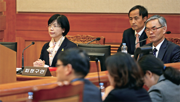 이재화 변호사(뒷줄 가운데)가 지난 11월25일 헌법재판소 대심판정에서 열린 통합진보당 해산심판 청구소송 최종변론에서 이정희 대표(왼쪽) 등과 함께 변호인석에 앉아 있다. 이 변호사는 최종변론에서 “14년간 멀쩡하게 활동해온 정당을 느닷없이 북한식 사회주의를 추구하는 정당이라고 몰아붙이며 해산 청구하는 것은 민주노동당 등을 지지한 국민에 대한 모독”이라고 말했다. 한겨레 이정용 선임기자