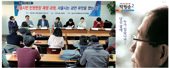 지난 12월2일 서울 정동 민주노총 교육장에서 서울시민인권헌장 제정 시민위원회 관계자 등이 제정 과정에서 빚어진 서울시의 행태를 비판하는 토론회를 열었다(왼쪽). 박원순 서울시장의 선거 포스터가 새삼 주목받고 있다. 정용일 기자, 박원순 서울시장 선거본부 제공