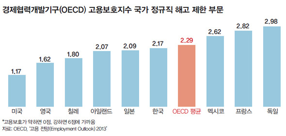 OECD는 1980년대 이후 회원국들의 고실업이 지속되자 그 원인이 고용보호법제와 관련이 클 것이라는 가정하에 관련 연구를 했다. 고용보호법제를 지수화해 각국의 고용보호 경직성을 평가했는데 고용보호가 약하면 0점, 강하면 6점에 가깝다. 2013년 OECD 고용보호지수 자료를 보면, 한국의 정규직 해고 제한 점수는 2.17점으로 OECD 평균(2.29점)에 미치지 못한다. 노동시장 현실이 법에서 보장된 수준보다 떨어지는 것을 감안하면, “정규직이 과보호돼 있다”는 최경환 부총리의 말은 어리둥절하다. 독일은 2.98점으로 1위를 기록했다.