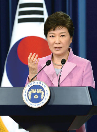 박근혜 대통령이 2014년 1월6일 청와대에서 신년 기자회견을 하는 모습. 당시 기자들이 사전에 질문을 알려주고 대통령이 답하는 형식으로 진행돼 국민과의 소통 방식을 두고 비판이 일기도 했다. 청와대사진기자단
