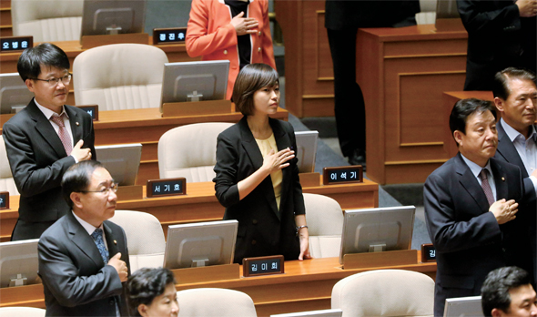 19대 국회 출범 뒤 통합진보당 소속 의원들은 각자 상임위원회에서 충실한 활동을 해왔지만 헌법재판소의 결정에는 아무 효력을 발휘하지 못했다. 2012년 9월 국회 개원식에 참석한 김재연 전 진보당 의원이 국민의례를 하고 있다. 한겨레 이정우 기자