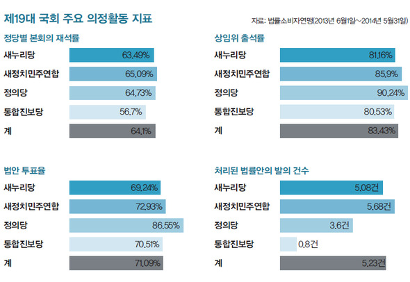 정량평가 항목을 기준으로 진보당 의원들의 의정활동을 톺아보면 성적이 그리 좋은 것은 아니다. 19대 국회 2차 연도(2013년 6월~2014년 5월)를 기준으로 시민단체인 법률소비자연맹이 분석한 결과를 보면, 진보당의 본회의 재석률은 새정치민주연합(65.09%), 정의당(64.73%), 새누리당(63.49%)에 견줘 한참 뒤처진 56.7%에 지나지 않는다. 법안 투표율(70.51%)은 새누리당(69.24%)보다는 낫지만 정의당(86.55%), 새정치연합(72.93%)에 못 미친다. 진보당의 한 기존 당직자는 “내란음모 사건 수사에, 의원 자격 심사 청구에, 정당해산 심판까지 국회 개원 이후 줄곧 태풍의 눈이었다. 이와 관련한 의원들의 단식이 있었고 세월호 참사 뒤에도 농성 참여, 등원 거부 등으로 자의 반 타의 반 회의 출석에는 모자란 부분이 있었을 것으로 본다”고 설명했다.