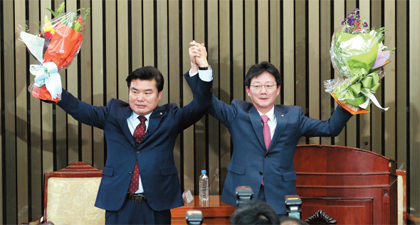 지난 2월2일 국회에서 열린 새누리당 원내대표 및 정책위의장 선거에서 승리한 유승민 원내대표(오른쪽)와 원유철 정책위의장(왼쪽)이 꽃다발과 함께 맞잡은 손을 들어 보이고 있다. 한겨레 김경호 선임기자