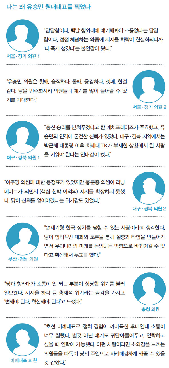 그동안 당 지도부가 어긋나게 행동하는 청와대를 제대로 견제하지 못하고 거수기 노릇만 해온 것에 대한 지적도 나왔다. 이런 분위기 속에서 청와대에 ‘쓴소리’를 하는 대신 ‘입단속’을 해야 했던 의원들의 피로감이 선거에서 상당하게 작용했다는 것이다. 한 비례대표 의원은 이렇게 말했다. “지금 새누리당의 문제는 의원들이 소외감을 느낀다는 것이다. 158명 한명 한명이 헌법기관으로서 역량이 뛰어난데 그들이 스스로 외롭다고 느끼고 있다. ‘내가 국회의원으로서 뭘 하는 거지?’라는 생각을 하는 거다. 주체적으로 역량을 발휘할 통로나 기회가 없고 하다못해 말조차 편하게 하지 못하는 것, 의원들이 당의 주인이 되지 못하는 것이 우리 당의 가장 큰 문제였다. 유승민 원내대표라면 의원들의 이런 소외감을 잘 다독여 새누리당의 주인으로 자리매김하도록 해줄 수 있을 것이라고 생각했다.”