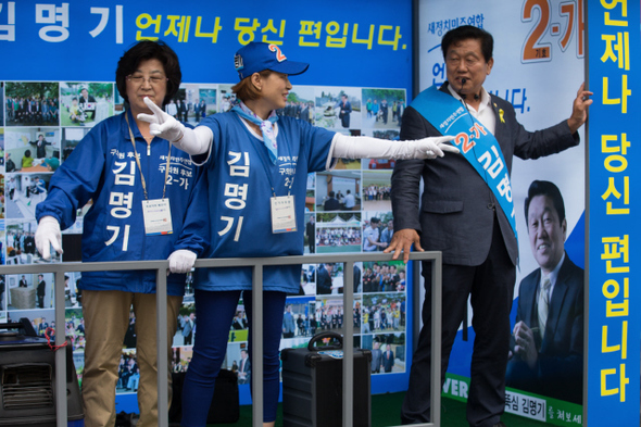 지난해 6·4 지방선거에서 선거운동원들이 기초의원 후보자 지지를 호소하고 있다. 우리나라에서 선거운동을 하려면 선거운동원으로 공식 등록해야 하며, 자신이 운동원임을 알리는 목팻말을 매달고 다녀야 한다. 한겨레 김성광 기자.