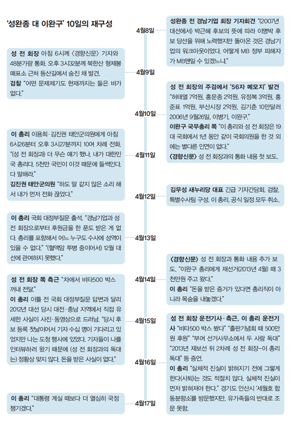 슬픔에 웅크리고 있던 서산장학재단 쪽 사람들의 분기에 불을 지른 것은 이 총리다. 그는 4월11일 아침 6시26분부터 오후까지 태안군의회 이용희·김진권 의원에게 모두 10여 차례 전화를 했다. 두 사람은 성 전 회장이 4월8일 서울에서 기자회견을 한 뒤 따로 만난 ‘심복’들이다. 그 자리에서 성 전 회장은 이들에게 “이완구가 나한테 이러면 안 되는데…”라고 말했다. 이들은 이 총리가 오간 말들이 뭐냐며 추궁하고 닦달하는 전화를 계속 걸어오자 언론에 이런 내용을 공개해버렸다.