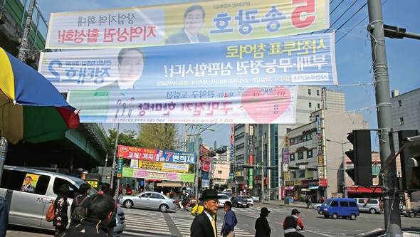투표를 앞두고 거리에서 일터에서 만난 주민들은 대화 중에 자주 분열했다. “이제는 당이나 사람이 아니라 정책을 봐야지” 하다가 “정책은 사탕발림이지. 어차피 안 지킬 거. 1년짜리 국회의원이 뭘 하겠나”로 넘어갔다가, “그래도 당이 중요한데, 실천할 힘이 있어야 하는데”로 돌아왔다. 인터뷰에 응한 주민들은 대부분 투표에 충실해왔기에 ‘묘한 자부심’이 얼굴에 떠오르다가도, 이내 피로해했다. “선거 고문”이란 말까지 나왔다. 대화는 자주 한숨, 회의, 실망감, 무기력함 같은 ‘감정 전달’이 압도했다. “성완종 사건은 아무것도 아니야. 정치를 돈 없이 어떻게 하나. 다들 받았을 거야”라고 말할 때, 주민들의 표정과 목소리는 사약을 들이켠 사람처럼 굳었다.