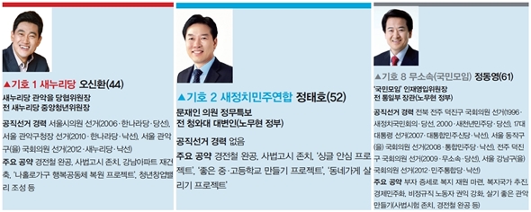 재보선은 정식 선거로 뽑힌 지역 대표의 빈자리를 채운다는 원칙적 의미보다, 정부·여당에 대한 중간 평가이자 각 정당 지도부의 리더십을 평가하는 무대로 대우받는다. 중앙당이 ‘총력전’에 나서는 이유다. 재보선은 중앙정치의 이해관계와 갈등에 대한 ‘대리전’이다. 서울 관악을 지역은 4·29 재보선을 치르는 4곳 가운데서도 경쟁이 치열한 격전지다. 후보는 새누리당(오신환), 새정치민주연합(정태호), 공화당(신종열) 소속 각 1명, 무소속 3명으로 모두 6명이다. 무소속 후보로는 ‘국민모임’ 정동영, 논객 변희재와 지역 기업인 송광호가 나섰다. 여당, 야당, 국민모임의 삼파전이 두드러진다.