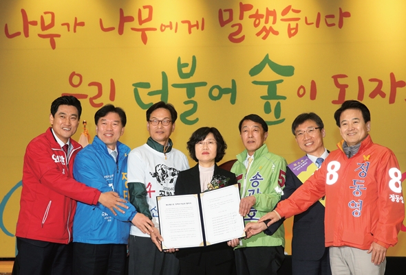 4월14일 오전 서울 관악구청에서 관악을 국회의원 후보자들이 매니페스토 정책선거 협약 및 공명선거 다짐 대회에 참여해 기념 촬영을 하고 있다. 한겨레 신소영 기자