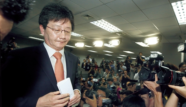 유승민 의원이 지난 7월8일 새누리당 원내대표 사퇴 기자회견을 한 뒤 국회 정론관에서 나오고 있다. 그는 자진 사퇴를 하지 않았던 이유에 대해 “법과 원칙, 정의의 가치를 지키고 싶었다”고 말했다. 한겨레 이정아 기자