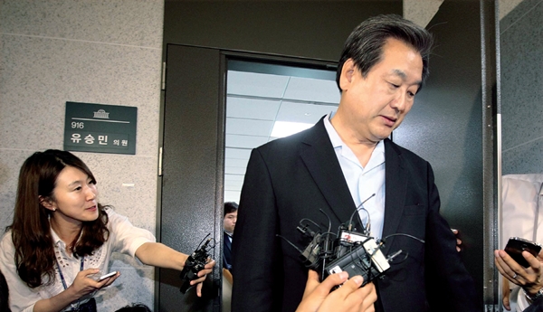 김무성 새누리당 대표가 7월8일 유승민 의원에게 사퇴를 권고한 의총 결과를 전한 뒤 유 의원의 의원실인 916호 방에서 나오고 있다. 사진공동취재단