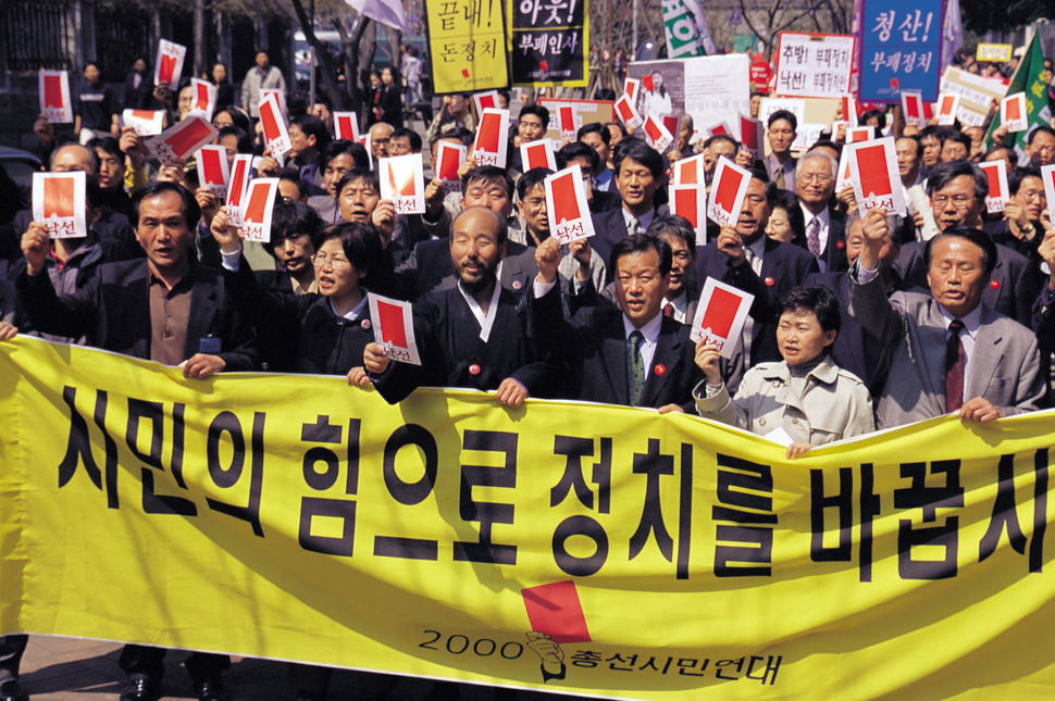 시민사회 인사들이 2000년 총선에서 ‘낙선 후보’들을 상대로 낙선운동을 전개하는 모습. 한겨레 이정용 기자