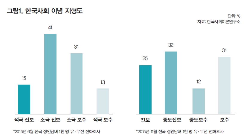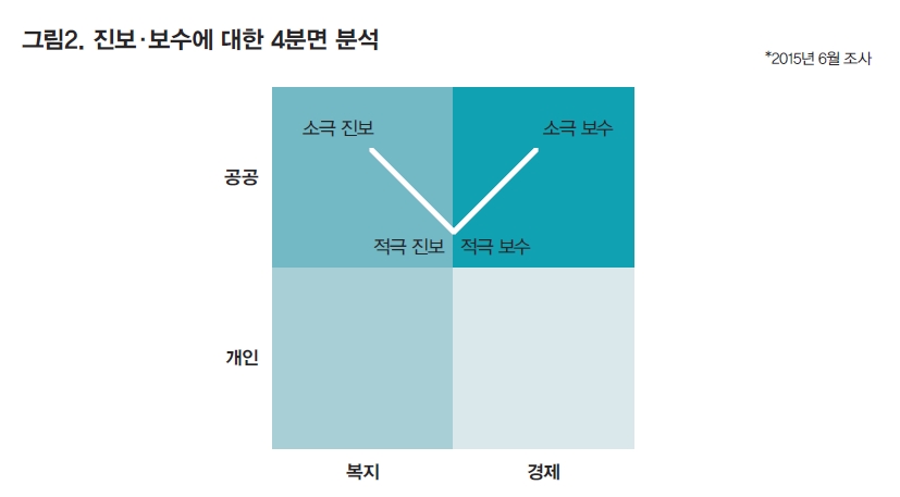 진보와 보수는 다원화됐다. 단순히 이념 전선 하나로 세상을 가를 수 있는 시대는 오래전에 끝났다. 그럼에도 정치권이 과거에 이미 묻힌 이념 지형을 끄집어내는 것은 대한민국의 미래보다는 당리당략적 접근이라는 비판을 받을 수 있다. 소극 보수층에 있는 ‘경제 보수’는 새누리당의 역사 교과서 국정화에, 소극 진보층에 있는 ‘자유 진보’는 노동개혁 반대에 동의하지 않을 가능성이 높기 때문이다.