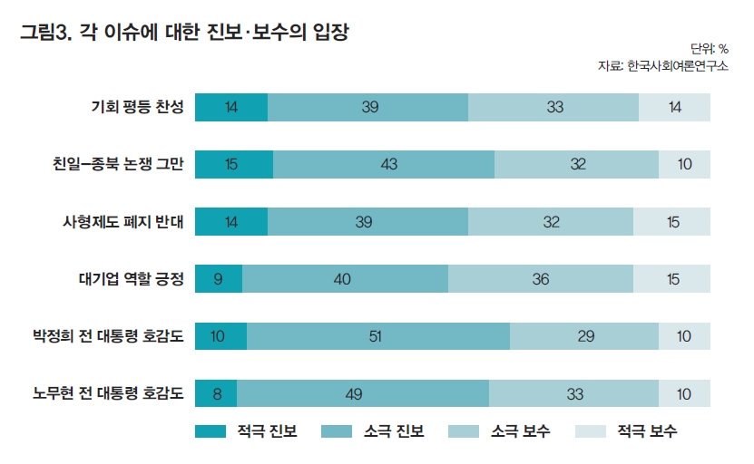 흥미로운 조사 결과도 있었다. 상대평가가 아니라 호오도(절대평가)로 ‘박정희 전 대통령 호감도’를 묻는 질문에 적극 보수(10%)나 소극 보수(29%)보다 소극 진보의 평가(51%)가 더 긍정적이었다. ‘노무현 전 대통령 호감도’에서는 이와 반대로 적극 진보(8%)보다 소극 보수(33%)의 평가가 더 높았다. 또 ‘기업의 경쟁력보다 환경보호가 더 중요하다’는 문항에서 적극 진보(9%)보다 소극 보수(15%)가 더 많이 동의했다. 기존 관념을 벗어나는 결과들이었다.