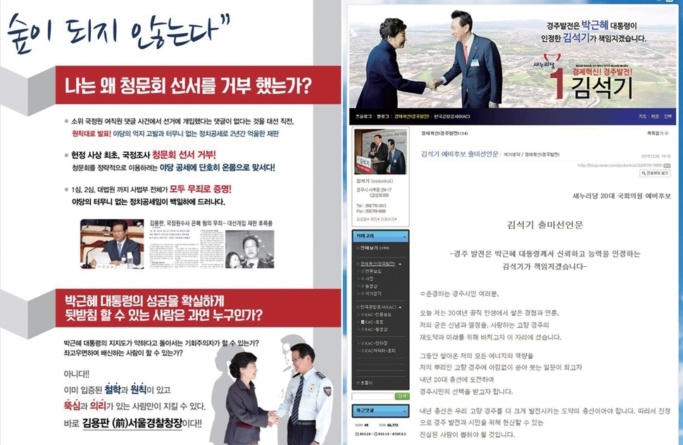 제20대 총선 출마를 선언한 전 서울지방경찰청장 김용판씨의 선거홍보물(왼쪽)과 김석기씨의 출마선언문. 김용판·김석기 블로그 갈무리.