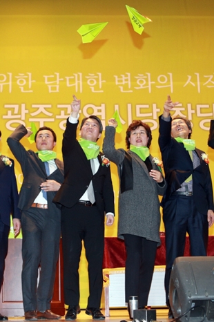 연대에 부정적인 안철수 의원이 1월21일 국민의당 광주시당 창당대회에서 종이 비행기를 날리고 있다. 연합뉴스