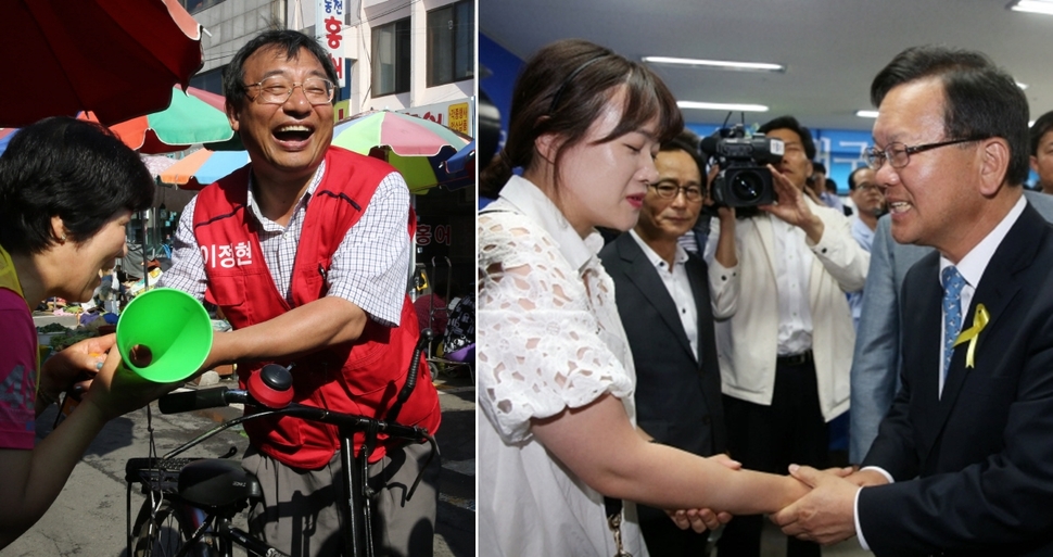 지역주의 벽은 두껍다. 그러나 철의 장벽은 아니다. 범민주당의 텃밭 호남에서는 이정현 새누리당 의원(전남 순천·곡성, 왼쪽)이 재선을 노린다. ‘대구의 강남’ 수성갑에서는 김부겸 더불어민주당 의원이 ‘이전삼기’도전에 나선다. 한겨레 박종식 기자, 한겨레 강재훈 선임기자