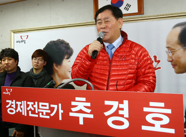 ‘진박 감별사’ 최경환 새누리당 의원(전 경제부총리 겸 기획재정부 장관)이 2월3일 대구시 달성군 화원읍에서 열린 추경호 전 국무조정실장의 선거사무소 개소식에서 축사로 ‘진박 인증’을 하고 있다. 연합뉴스