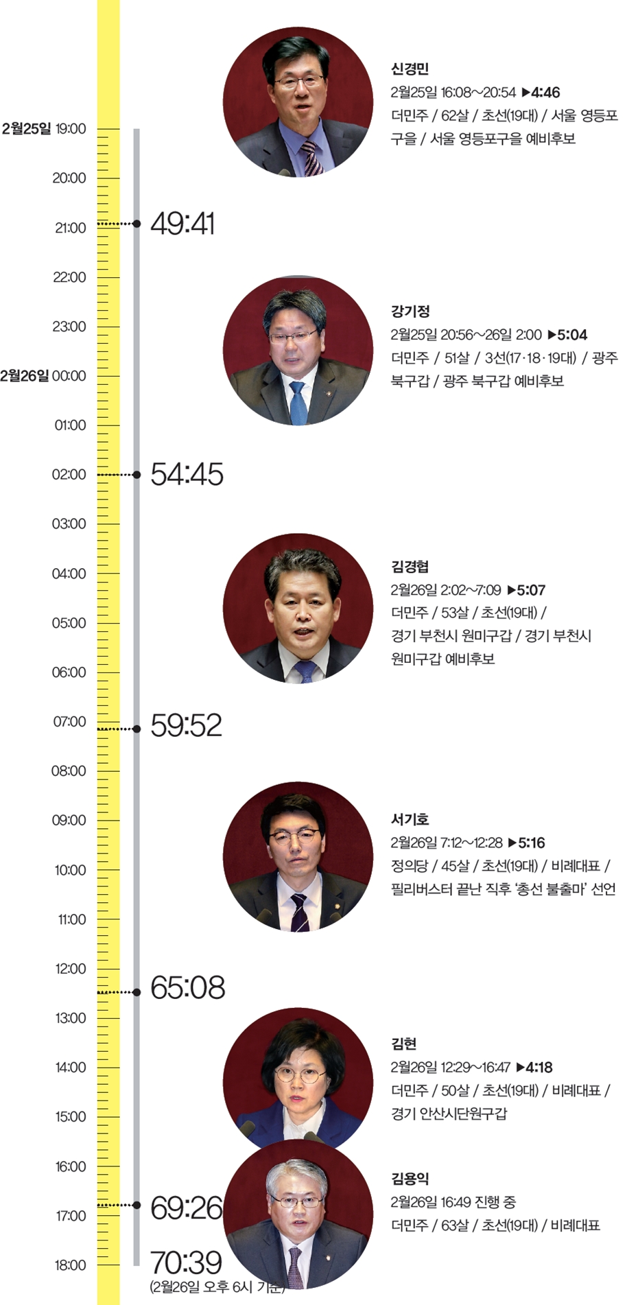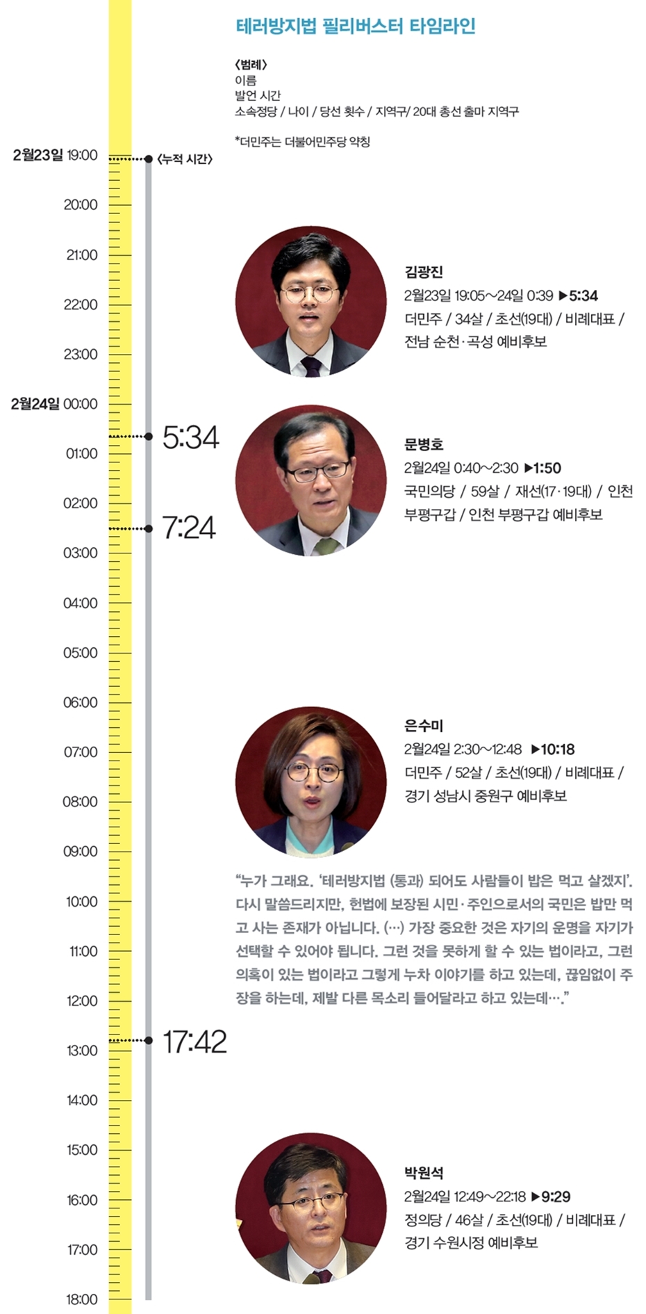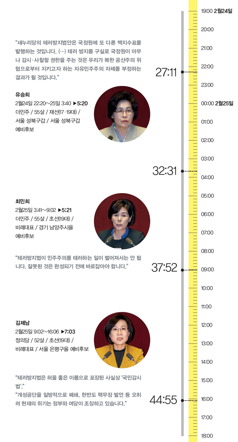 “(연설 시간) 기록은 의미 없다.” 테러방지법을 막으려는 야당의 무제한토론(필리버스터)이 70시간을 넘겼다(2월26일 오후 6시 기준). 이번 필리버스터에서는 특히 선발로 나선 초선 국회의원들의 ‘내공’이 주목받았다. 그들이 한목소리로 한 말이다. “(기록보다는) 테러방지법이 도대체 어떤 법이길래 이런(필리버스터) 제도까지 사용한 건가, 그걸 알아줬으면 한다.”(김광진 의원)