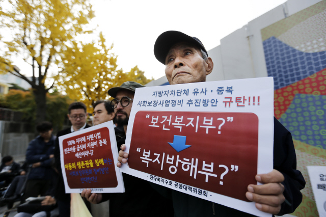 ‘전국복지수호 공동대책위원회’ 회원들이 2015년 11월11일 서울 삼청동 총리공관 앞에서 지방자치단체의 자체 복지사업을 중앙정부가 막아선 것에 항의하고 있다. 한겨레 김명진 기자