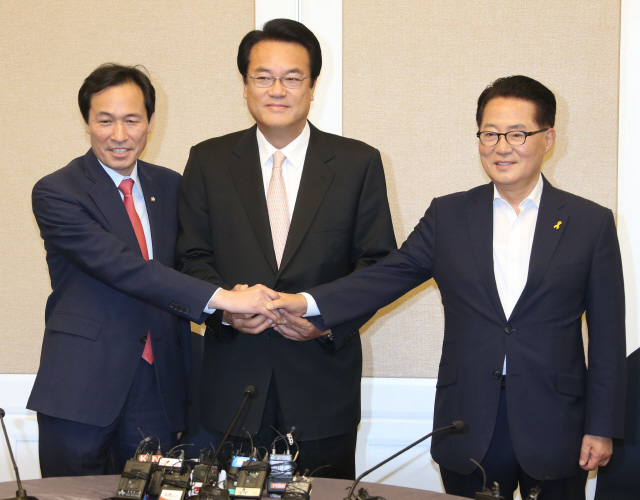더불어민주당 우상호, 새누리당 정진석, 국민의당 박지원 원내대표(왼쪽부터)가 지난 5월19일 손을 맞잡고 있다. 정의당(의원 6명)은 원내 정당이지만 국회 운영을 함께 논의하는 원내 교섭단체(의원 20명 이상) 요건은 갖추지 못했다. 한겨레 이정우 선임기자