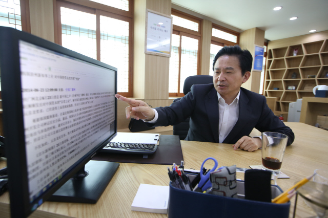 인터뷰 도중, 원 지사가 인터넷 검색으로 중국 언론의 기사를 보여주고 있다.