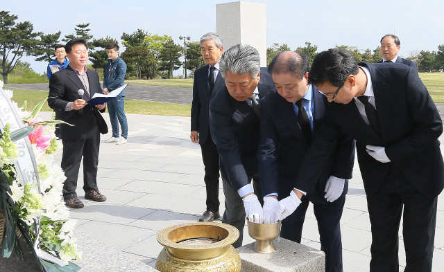 2012년 총선에 이어 지난 4월 총선에서도, 더불어민주당은 제주의 의석 3개를 모두 차지했다. 총선 직후인 4월15일 오영훈·강창일·위성곤 의원(왼쪽부터) 당선자가 제주4·3평화공원을 찾아 분향하고 있다. 연합뉴스