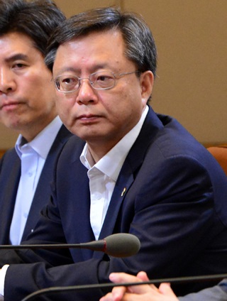 우병우 민정수석이 6월27일 청와대에서 열린 대통령 수석비서관 회의에서 박근혜 대통령의 말을 듣고 있다. 박근혜 정부의 핵심 실세로 꼽히는 우 수석은 의경인 아들 보직 특혜와 가족 회사인 ‘정강’ 회삿돈 횡령 혐의 등으로 친정인 검찰에서 수사받는 처지에 놓였다. 청와대사진기자단
