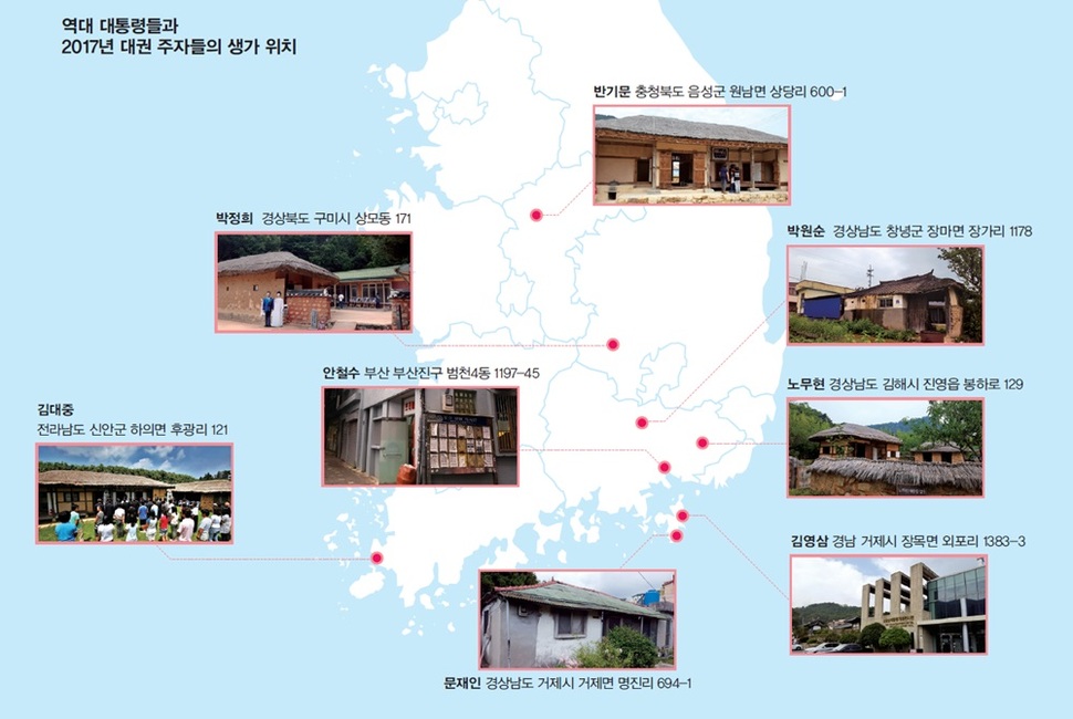 대통령이 태어난 집, 이른바 ‘생가’들을 9월6일 방문했다. 경북 구미에 있는 박정희 전 대통령의 생가와 경남 김해에 있는 노무현 전 대통령의 생가다. 이 밖에 대통령의 생가는 경남 거제 김영삼 전 대통령의 생가, 전남 신안군 김대중 전 대통령 생가 등이 보존돼 있다.
