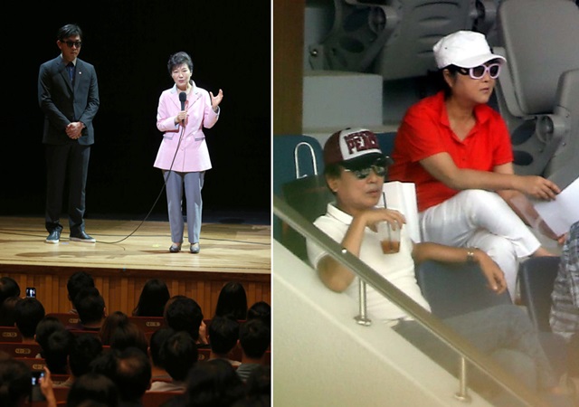 2014년 박근혜 대통령이 서울 종로구 상명대에서 공연 ‘하루’를 관람하기에 앞서 인사말을 하고 있다(왼쪽). 대통령의 왼쪽에 선 이가 공연 총연출을 맡은 차은택 감독이다. 2014년 박근혜 대통령의 비선 실세로 알려진 최순실씨(오른쪽)가 경기도 과천 경마공원에서 전남편 정윤회씨와 딸의 경기를 지켜보고 있다. 연합뉴스, 한겨레 박종식 기자