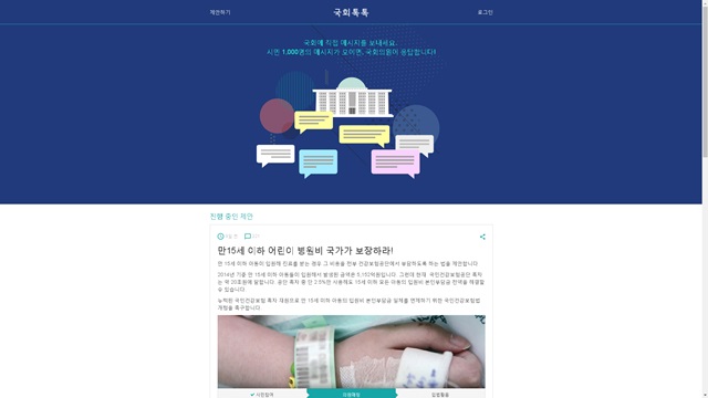 오진아 현재 진행 중인 어린이 병원비 이슈의 지지자는 700명이다. 1천 명이 되면 2단계 국회의원 매칭이 시작된다(인터뷰 이후 하루 만에 지지자 1천 명을 달성했다). 현재 그 제안 페이지에 해당 이슈를 다뤄야 하는 국회 상임위원회 의원 명단을 올려두었다. 1천 명에 도달하면 해당 상임위 의원 전원에게 전자우편으로 알리고, 입법 참여 여부를 2주 안에 알려달라고 요청할 계획이다. 응답이 오건 안 오건 그 내용을 그대로 국회의원 사진 밑에 표시할 것이다.