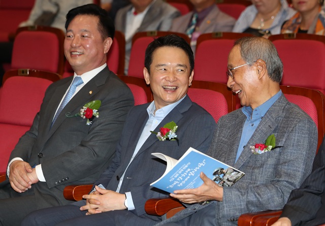 윤여준 전 환경부 장관(오른쪽)과 남경필 경기도지사가 9월5일 서울 여의도 국회의원회관에서 열린 ‘모병제 희망모임 제1차 토크’ 행사에 나란히 앉아 이야기를 나누고 있다. 윤 전 장관은 지난 5월 경기도가 추진하는 평생교육 온라인 프로그램인 지무크(G-OOC)