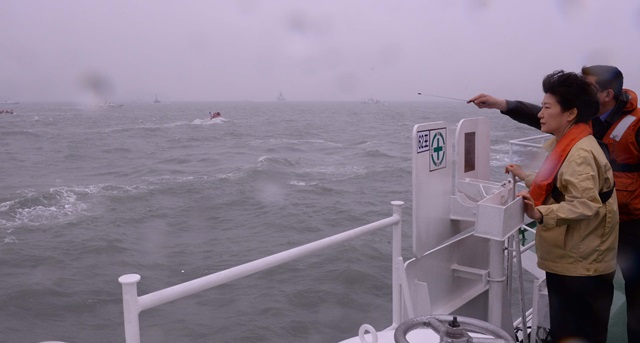 2014년 4월17일 박근혜 대통령이 세월호 사고 현장인 전남 진도 바다를 살펴보고 있다. 청와대사진기자단