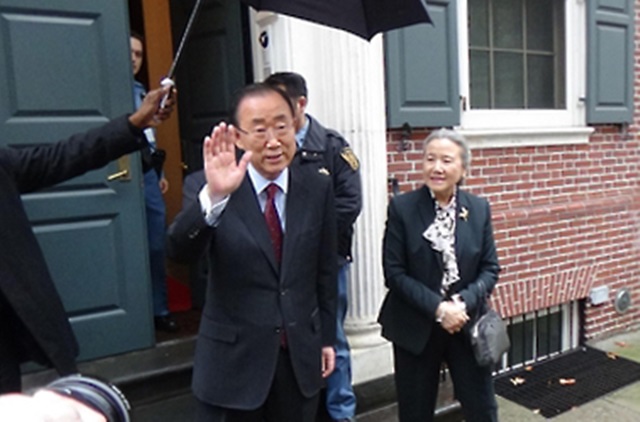 반기문 전 사무총장이 1월3일 미국 뉴욕의 유엔 사무총장 공관을 떠나며 손을 흔들고 있다. 연합뉴스