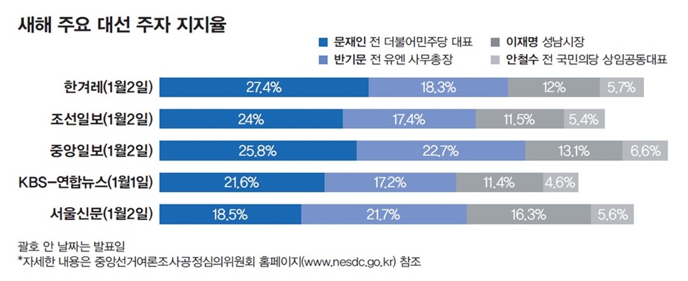 새해 각 언론사가 실시한 여론조사 결과는 반 전 총장으로선 실망스런 지표다. 반 전 총장은 <서울신문> 여론조사를 제외하고는 모두 문재인 전 대표에게 밀린 2위에 올랐다. 일부 조사에선 출신지인 충청권에서도 뒤졌다. ‘박근혜·최순실 게이트’가 불거지기 전인 지난해 9월까지 선두를 달렸을 때와 견주면 지지율이 반토막 나다시피 했다. 조직이나 세가 부족한 탓에 귀국 ‘컨벤션 효과’ 등 ‘바람’에 기대야 하는 반 전 총장 쪽으로서는 초조함을 불러일으킬 결과인 셈이다. 한 여론조사 전문가는 “반 전 총장 쪽이 상당한 충격을 받았을 것”이라고 말했다.