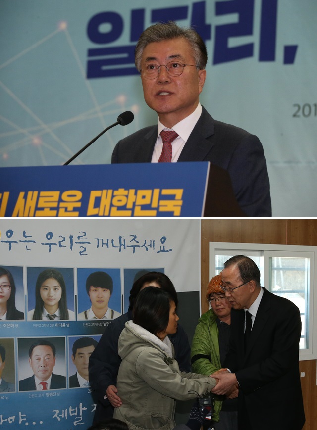 문재인 전 더불어민주당 대표가 1월18일 국회에서 경제정책의 핵심인 일자리 공약을 발표하고 있다(왼쪽). 전날 반기문 전 유엔 사무총장이 전남 진도 팽목항을 찾아 세월호 미수습자 가족과 이야기를 나누고 있다. 한겨레 이정우 선임기자