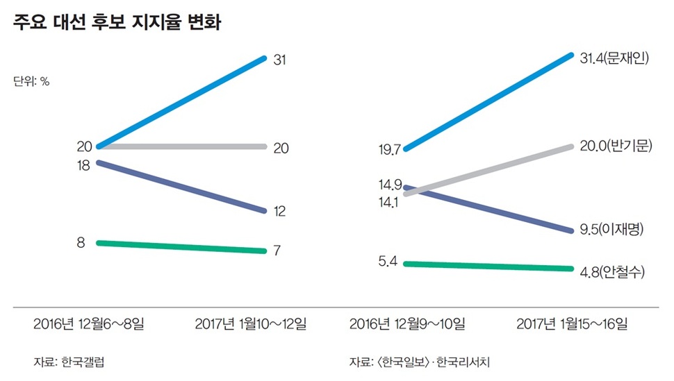 반면 문 전 대표는 어느 때보다 진보 진영의 높은 지지를 받고 있다. 탄핵안이 국회에서 가결된 뒤 한 달 사이에 호남 지지율이 두 배 가까이 뛰었다. ‘문재인 대세론’에 이재명 성남시장과 박원순 서울시장, 안철수 국민의당 의원 등이 선명한 정체성을 앞세워 공세에 나서고 있지만 지지율 격차는 좁히지 못하고 있다. 문 전 대표가 본선으로 직행하는 전략적 유연성을 발휘할 정도로 여유가 있는 상황이다.