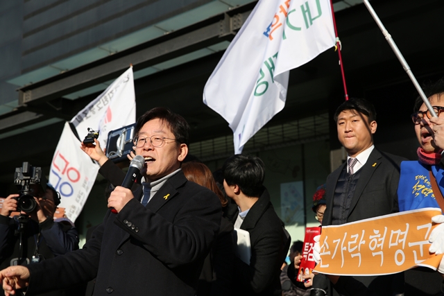 지난 2월24일 서울 광화문 촛불집회에서 이재명 성남시장이 연설하고 있다. 그의 지지모임인 ‘손가락혁명군’이 함께했다. 류우종 기자