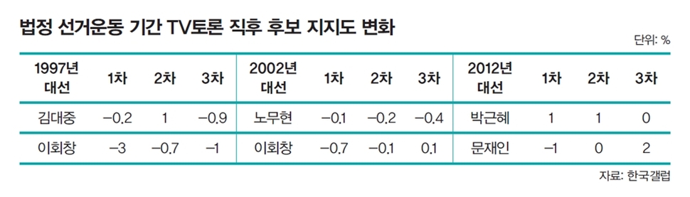대통령 후보 TV토론은 1997년 대선을 한 달 앞두고 공직선거법이 개정되면서 법적으로 의무화됐습니다. 본격적인 미디어 선거가 시작된 거죠. 당시 김대중 후보와 이회창 후보는 법정 선거운동 기간 TV에 나와 세 차례 토론을 했습니다. 유권자는 TV토론으로 후보 간 우열을 가리기 어려웠습니다. 김대중 후보의 지지도는 1차 -0.2%, 2차 +1.0%, 3차 -0.9% 등락했고, 이회창 후보의 지지도는 1차 -3.0%, 2차 -0.7%, 3차 -1.0% 등락했습니다. 오차범위 내에서 미미한 변화를 보였습니다.