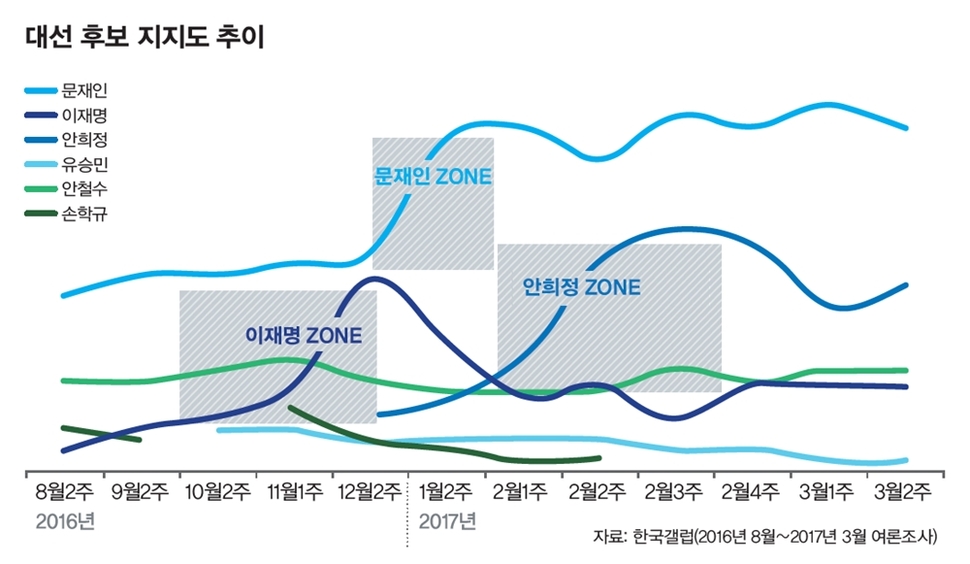대기업 재벌 처지에서 가장 부담스러운 후보는 이재명 후보가 아닐까 싶습니다. 만약 이 후보가 민주당 대선 후보로 선출된다면, 문재인 후보는 민주당이 안정적으로 국정을 뒷받침할 수 있도록 지원해야 할 겁니다. 안희정 후보는 같은 시대를 살아가는 동년배로서 국정 파트너로 함께해야 할지 모릅니다. # ‘조기 대선 프레임’의 수혜자 : 문재인 두 번째 장은 문재인 후보가 써내려갑니다. 2016~2017년 연말연초, 문재인 후보의 지지도가 20%에서 31%로 급등합니다. 국회의 대통령 탄핵이 얼마 지나지 않아, 우리가 미처 인지하지도 못한 시점에 ‘조기 대선 프레임’이 짜인 것 같습니다. 1위 후보가 최대 수혜자가 됩니다. 문 후보의 이미지가 지난해에는 ‘부드러움’ ‘온화함’ ‘균형감’이었다면, 지금은 ‘목표의식’ ‘꼼꼼함’ ‘카리스마’로 이어지는 듯 보입니다. 행정부에서 가장 부담스러운 후보는 국정 경험이 있는 문 후보가 아닐까 싶습니다. 만약 문 후보가 민주당 대선 후보로 선출된다면, 안희정 후보는 정당정치의 복원과 정당 시스템 정상화로 국정을 지원해야 할 겁니다. 이재명 후보는 개혁적 복지정책과 사회정책이 추진될 수 있도록 힘을 보태야 할 것입니다. # 알파와 오메가 ‘대연정’ : 안희정 마지막 장이자 현재진행형인 페이지입니다. 안희정 후보의 지지도가 유의미한 상승을 보인 시점은 2017년 1월 중순부터 2월 말까지입니다. 6%에서 22%까지 가파르게 상승했습니다. 대연정 논쟁이 기폭제가 되었습니다. ‘선의’ 발언과 ‘역대 대통령 평가’로 논쟁이 지속됐습니다. 몇 개의 이슈에 비슷한 맥락을 가진 하나의 논점이 자리잡고 있습니다. ‘짧은 민주주의 역사를 성찰하고 책임을 다하려는 직업정치인’의 고뇌라고 할까요. 대안 중심적인 안 후보의 태도로 보았을 때, 유력한 시민사회단체가 가장 부담스러워하지 않을까 싶습니다. 만약 안 후보가 민주당 대선 후보로 선출된다면, 하드웨어보다는 소프트웨어에 대한 지원이 절실할 것입니다. 문재인 후보는 정책 역량을, 이재명 후보는 개혁 동력을 지원하는 게 필요할 것입니다. # 유권자의 ‘후회 없는 선택’ 각 정당은 대선에 출전시킬 대표선수를 뽑는 경선에 돌입합니다. 유권자는 정당이 실시하는 여론조사 또는 선거인단 모집을 통해 지지 정당 후보를 선택할 수 있습니다. 유권자는 개인의 정치적 성향과 정책적 취향에 따라 후보를 선택할 겁니다. 이 선택은 환불이 쉽지 않습니다. 유권자의 후회 없는 선택은 가능할까요. 세 기준을 제시해봅니다. 민주정치 가장 민주적인 방식으로 후보를 선출하는 정당이 어느 곳인지 확인해야 합니다. 폭넓은 참여가 이루어져야 합니다. 충분한 숙의로 후보를 속속들이 알 수 있어야 합니다. 제품 사용자의 후기가 좋지 않거나, 제품설명서가 충분치 않다면 구매결정(지지)을 유보해야 합니다. 책임정치 경쟁 후보에게 흠집을 내기 위해 무리한 논거를 펴거나 막말을 하는 후보가 있는 정당, 경선 결과에 승복하지 않는 후보가 있는 정당은 지지 결정을 최대한 늦춰야 합니다. 국정운영은 대통령 혼자 하는 것이 아닙니다. 소속 정당이 뒷받침해야 안정적 국정운영이 가능합니다. 우리는 팀워크가 좋지 않아, 배가 산으로 가는 경우를 많이 봐왔습니다. 미래정치 개인의 유불리에 따라 역대 대통령을 특정해 언급하고 여론을 둘로 갈라놓는 후보가 있다면, 다시 한번 생각해봐야 합니다. 대선은 미래 선거이고 전망 선거입니다. 누구를 심판하거나 과거를 되돌리는 선거가 아닙니다. 대선은 대한민국이 어느 방향으로 가야 하고, 어떻게 갈지, 그 과정에 놓인 과제를 누가 가장 잘 해결할 수 있는지 후보와 유권자, 정당과 유권자가 합의하는 과정입니다. # 더 근본적인 선택의 문제 우리가 보통 어떤 것을 결정하고 선택할 때, 가장 후회하는 것은 ‘해야 할 때 하지 않는 경우’입니다. 유권자는 최선의 후보를 선택하는 것이 중요합니다. 이뿐만 아니라 선택(투표) 자체도 중요합니다. 최선의 후보가 없다면 차선의 후보라도 선택해야 합니다. 그러려면 후보의 더 많은 노력과 유권자의 더 많은 관심이 필요합니다. 최정묵 공공의창 간사