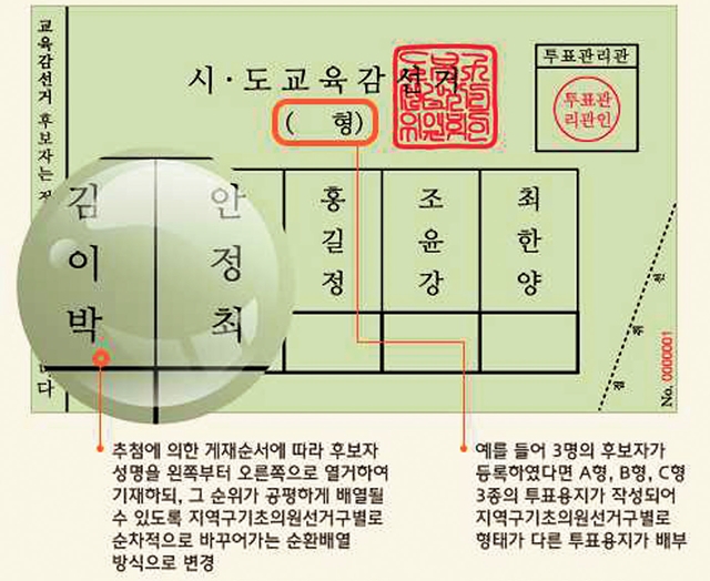 2014년 6월 교육감 선거에서 이름 순서가 공평하게 배열되는 ‘교호순번제’가 도입됐다. 선거관리위원회 (※이미지를 누르면 크게 보실 수 있습니다.)