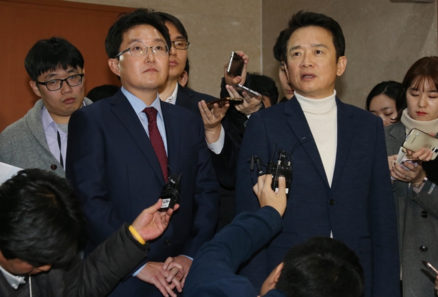 남경필 지사는 박근혜 게이트가 불거진 뒤 “생명이 다한 새누리당을 역사의 뒷자락으로 밀어내고자 한다”며 가장 먼저 새누리당을 탈당했다. 남 지사가 지난해 11월22일 탈당 선언을 한 뒤 김용태 의원(왼쪽)과 이정현 새누리당 대표의 사퇴를 촉구하고 있다. 한겨레 이정우 선임기자