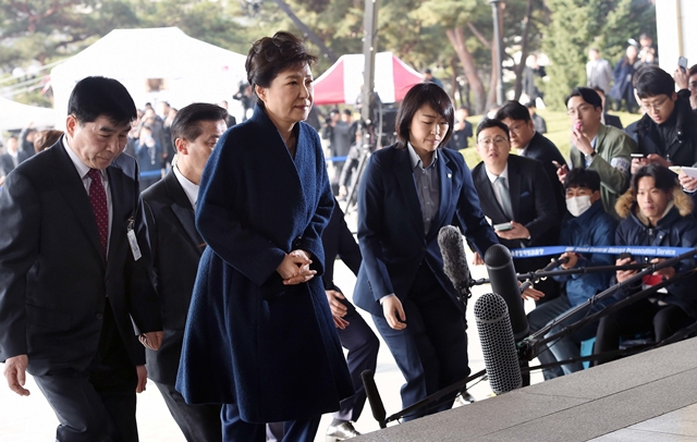 박근혜 전 대통령이 3월21일 서울 서초동 서울중앙지검 앞에서 기자들의 질문에 짧게 대답한 뒤 조사받으러 검찰청에 들어가고 있다. 사진공동취재단