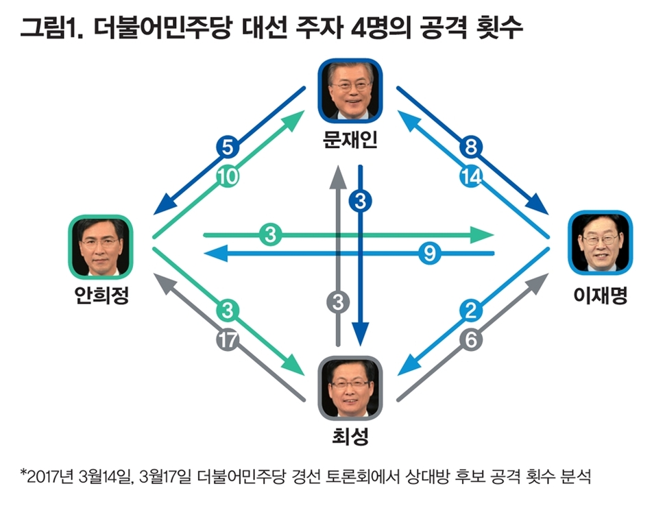 더불어민주당은 3월3일 CBS 라디오 방송을 시작으로 21일 MBC 토론회까지 총 여섯 차례 대선 후보 경선 토론회를 열었다. 문재인, 안희정, 이재명, 최성 등 후보 4명이 토론회 때마다 격돌했다. 문재인 후보의 ‘기득권’, 안희정 후보의 ‘대연정’, 이재명 후보의 ‘기본소득’ 등을 놓고 상대 후보들은 날카로운 창을 들어 공격했고, 그때마다 해당 후보는 미리 준비해온 방어 전략을 폈다. 이런 공격-방어 전략을 지켜본 유권자들은 때로 실망하고, 때로 열광했다. 표심을 흔드는 결정적 장면도 몇 차례 있었다.